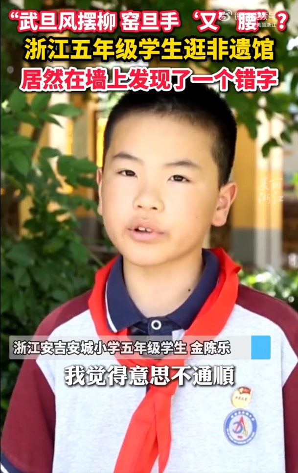 报道称,今年清明假期,这名同学参观之江文化中心非遗馆,发现戏曲介绍区“武旦风摆柳,窑旦手又腰”不太通顺。经查询,应为“手叉腰”。