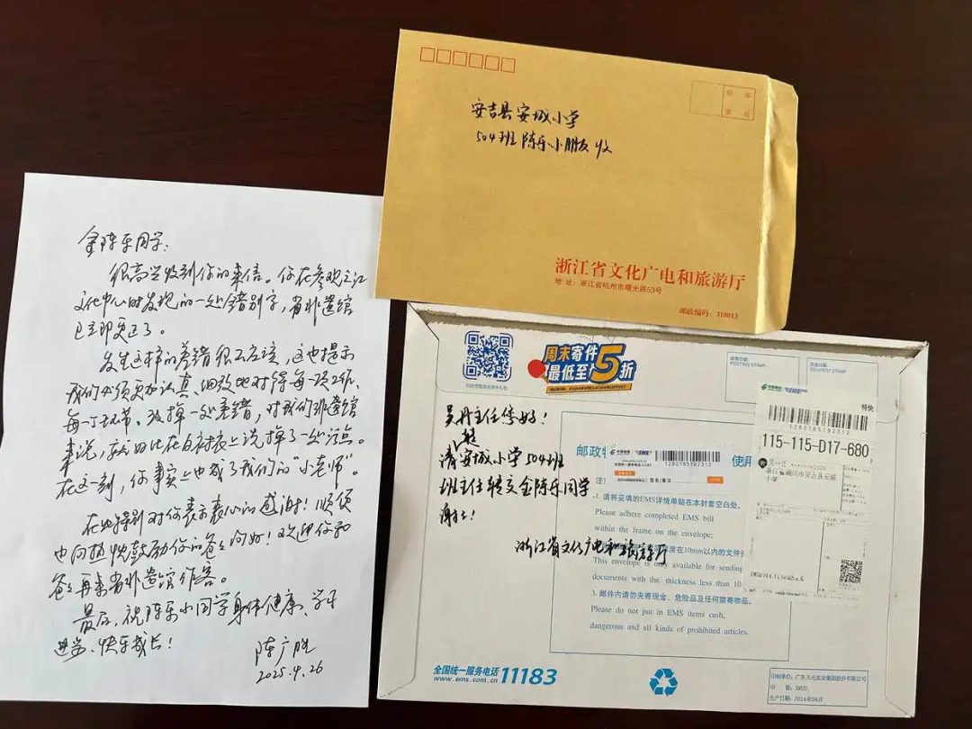 据“安吉发布”消息,近日,浙江省安吉县安城小学五年级学生金陈乐,收到了来自省文化广电和旅游厅党组书记、厅长陈广胜的手写信,并受邀重游非遗馆。
